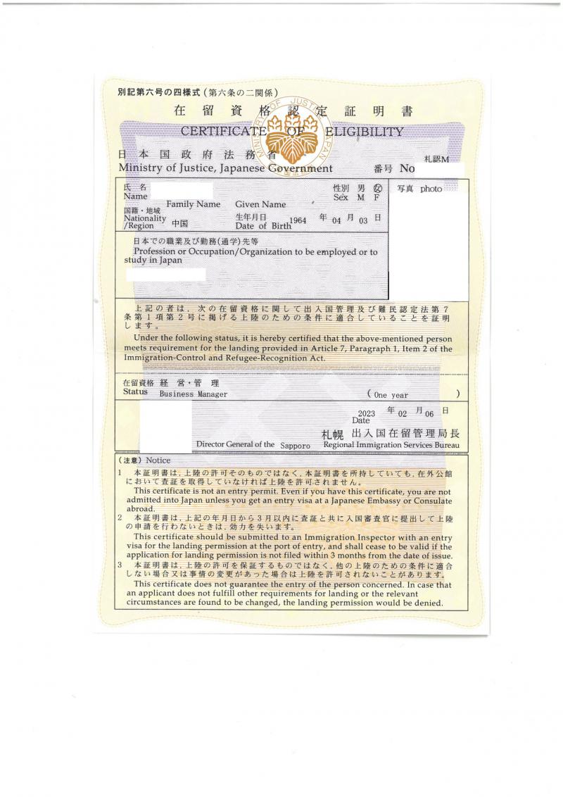 経営管理のビザ1名 認定証明が下りました。おめでとうございます!