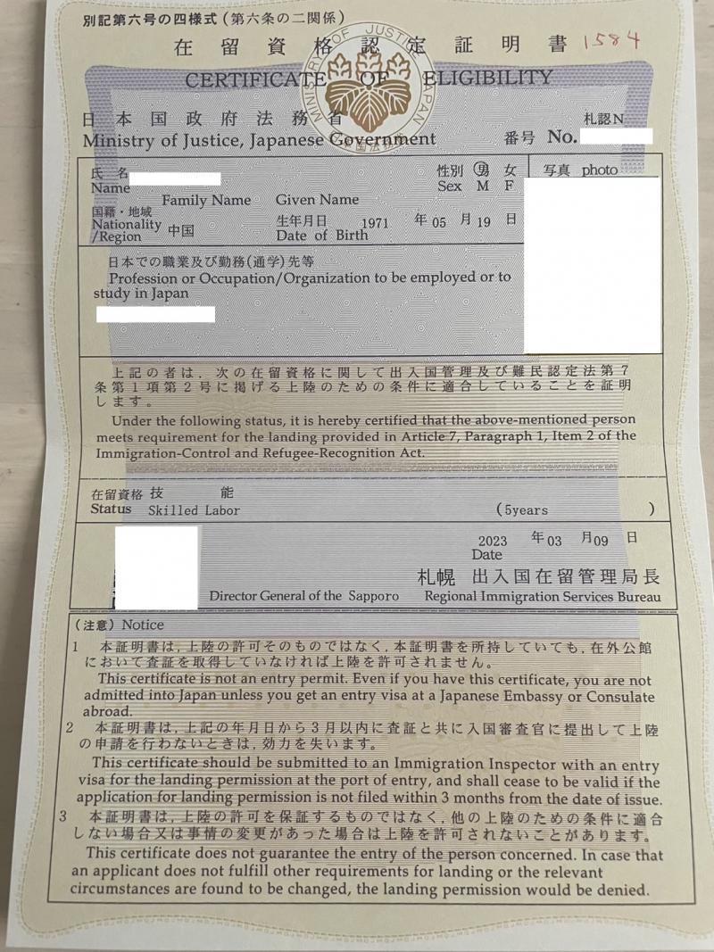 【在留資格認定証明書】技能
