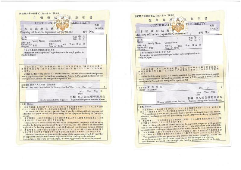 技人国と家族滞在ビザ 同時に認定証明がおりました。おめでとうございます!!