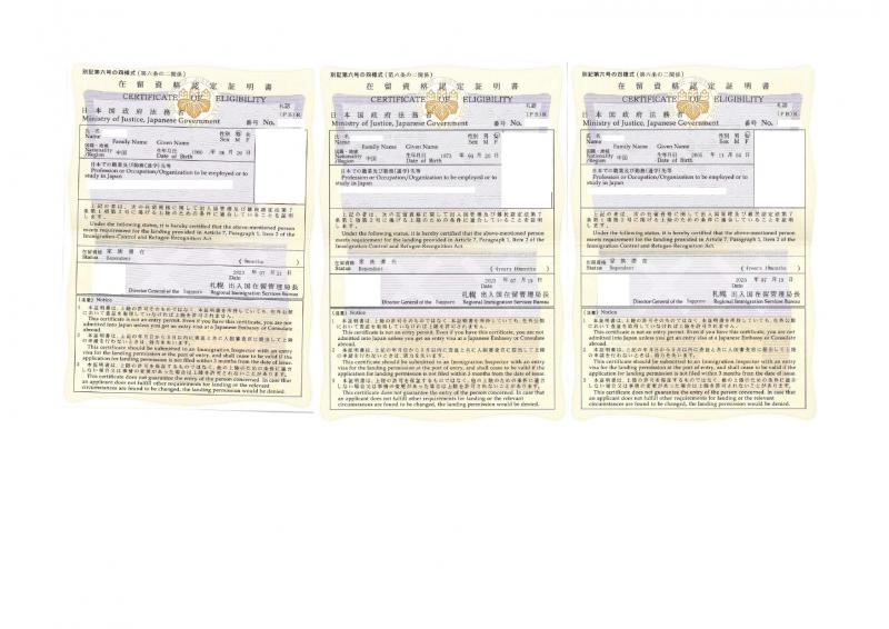 【在留資格認定証明書】家族滞在3名分